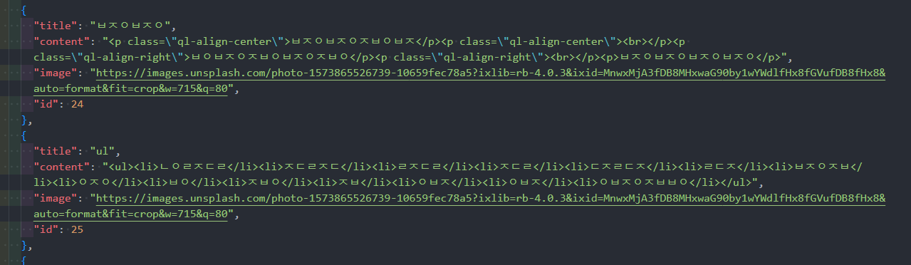 react-quill 라이브러리를 이용해 글을 작성하고 저장하면 아래와 같이 HTML 태그로 저장된다.