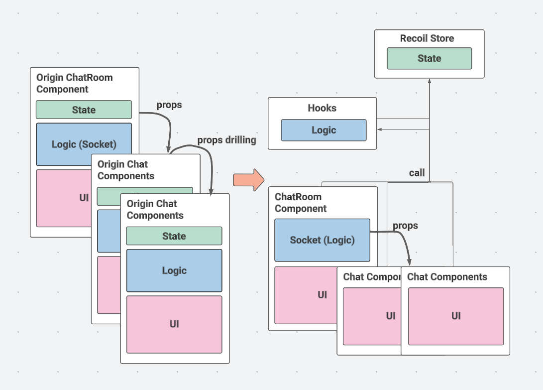 state는 recoil을 사용하여 분리하고 Socket과 관련된 로직을 제외한 모든 로직은 Hooks로 분리했다. 특정 상태와 로직이 필요한 컴포넌트는