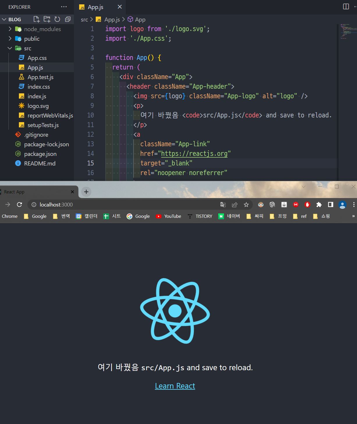- 열면 이렇게 생겼는데 src폴더의 App.js에서 코드 짤 거임